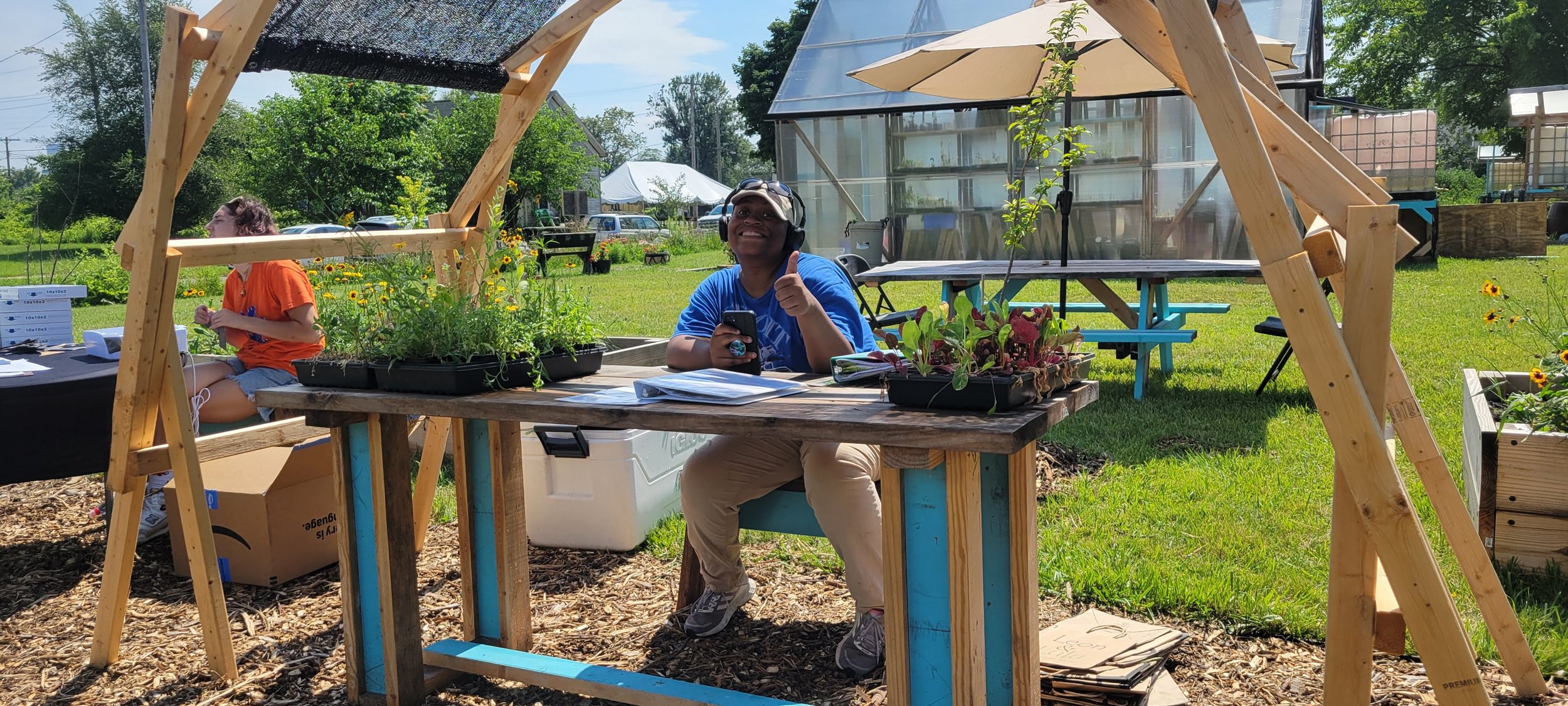 Freedom Dreams hosts a summer program in partnership with Grow Detroit's Young Talent. For six weeks, youth aged 14 to 21 learn the skills to Grow Food, Identify Plants, Assess Community Assets & Needs, and Build Public Infrastructure through the Design//Build process. Their learning is deeply place-based, with every lesson rooted by history, lived experience, and enacting solutions for the community. Some of these solutions have included garden beds for food production and beauty, shade pavilions and benches to encourage public gathering to support culture and community safety, and trash bins on every street corner to build pride and beauty for the community. We empower our youth to be active community members, following the ethos that our communities are up to us.